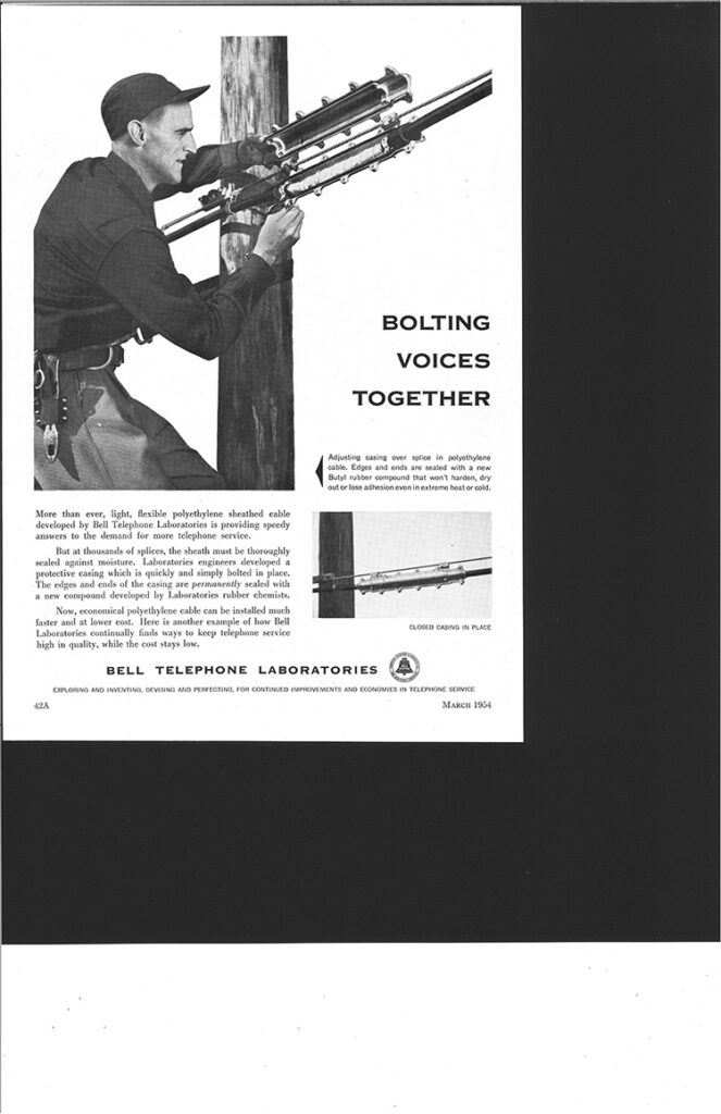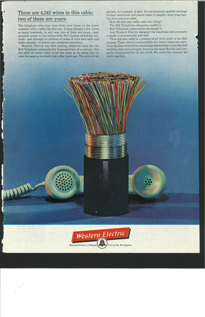 Beginning around the late 1940’s, that outer lead was now removed and replaced with various plastic coverings. The paper insulation remained, so the name “paper cable” is often used to identify them. Paper cables have a paper mulch insulation of the tip and ring wires, an outer polymer (plastic) jacket, and just like lead cables they were “air core”, meaning they had no filled interior. Paper cables are also commonly referred to as “pulp cables”, but they mean the same thing. These paper/pulp cables were manufactured from about the late 1940’s up to 1958.